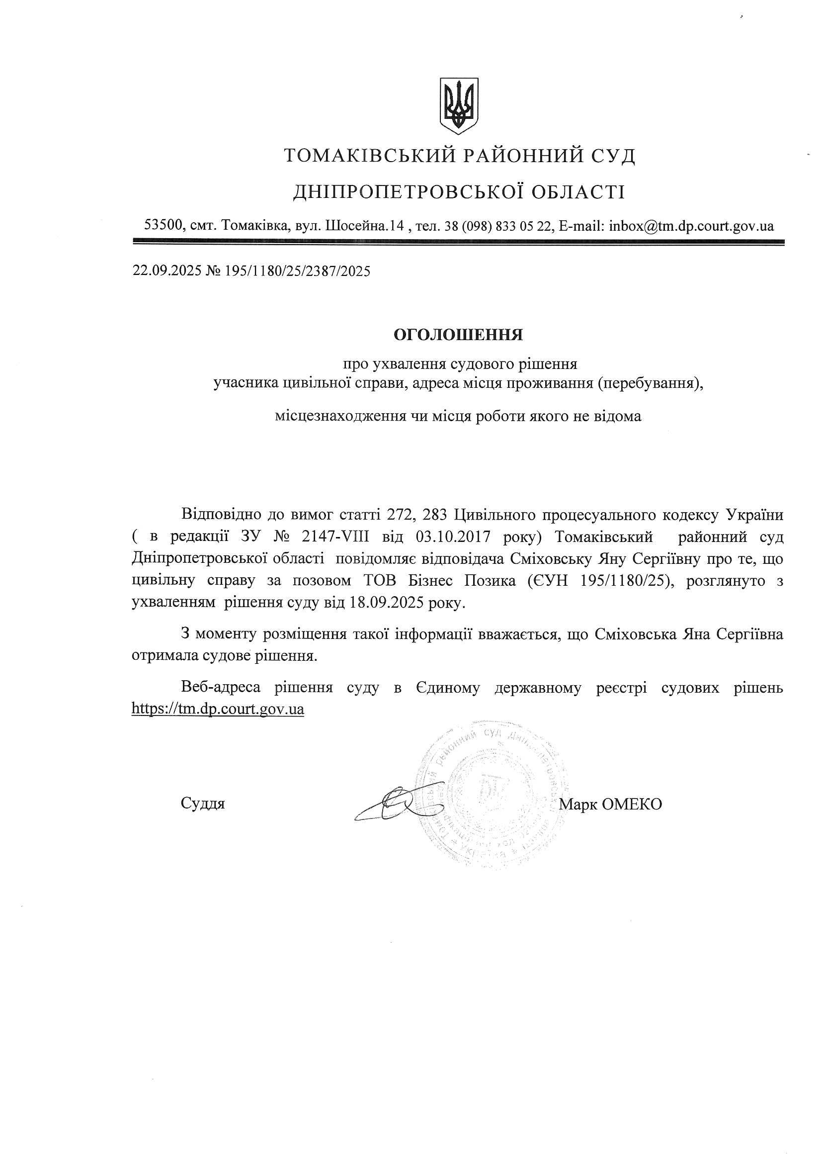 Оголошення про ухвалення рішення суду