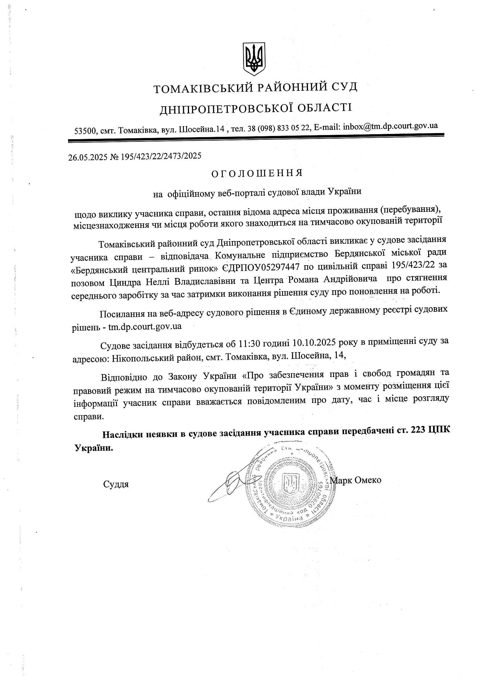 Томаківський районний суд Дніпропетровської області