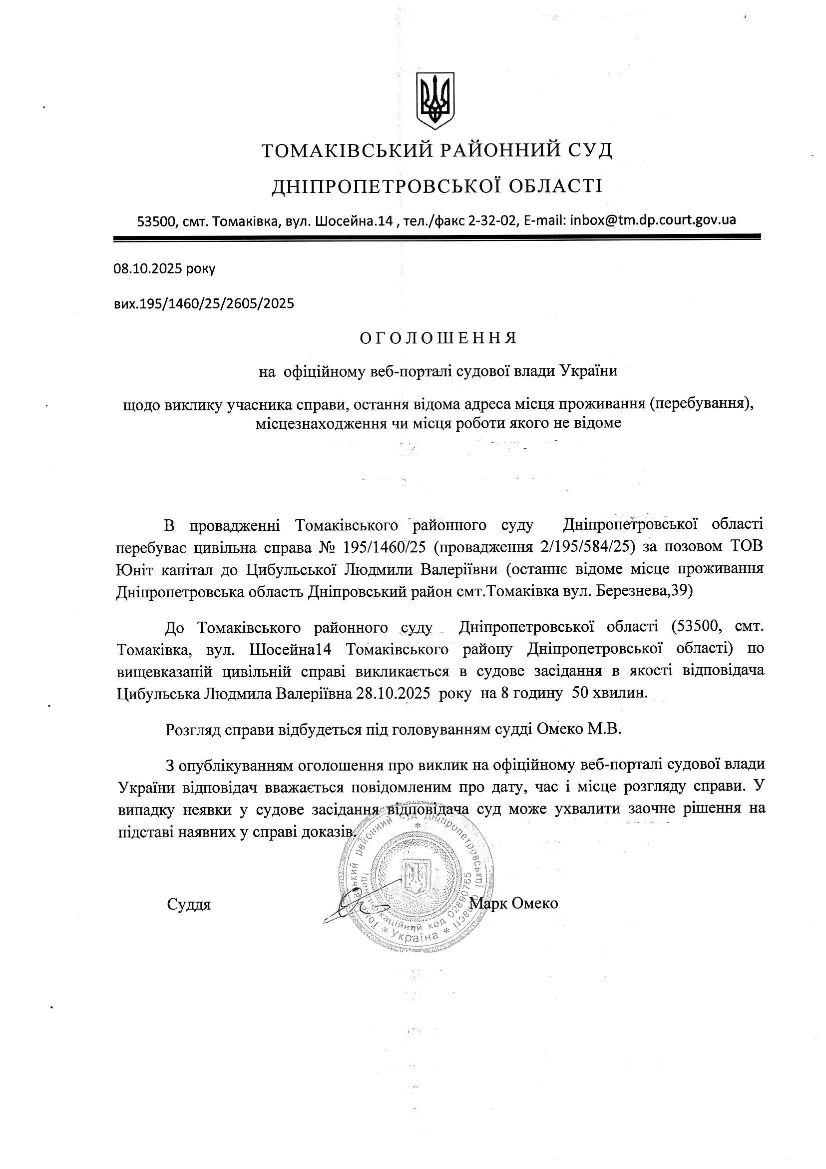 Оголошення щодо виклику учасника справи