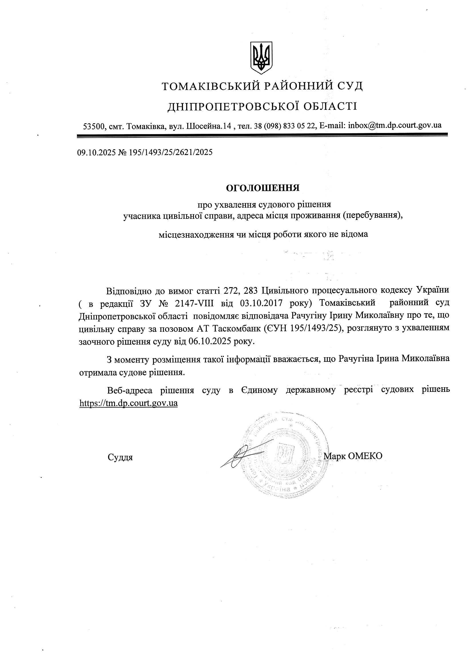 Оголошення про ухвалення рішення суду