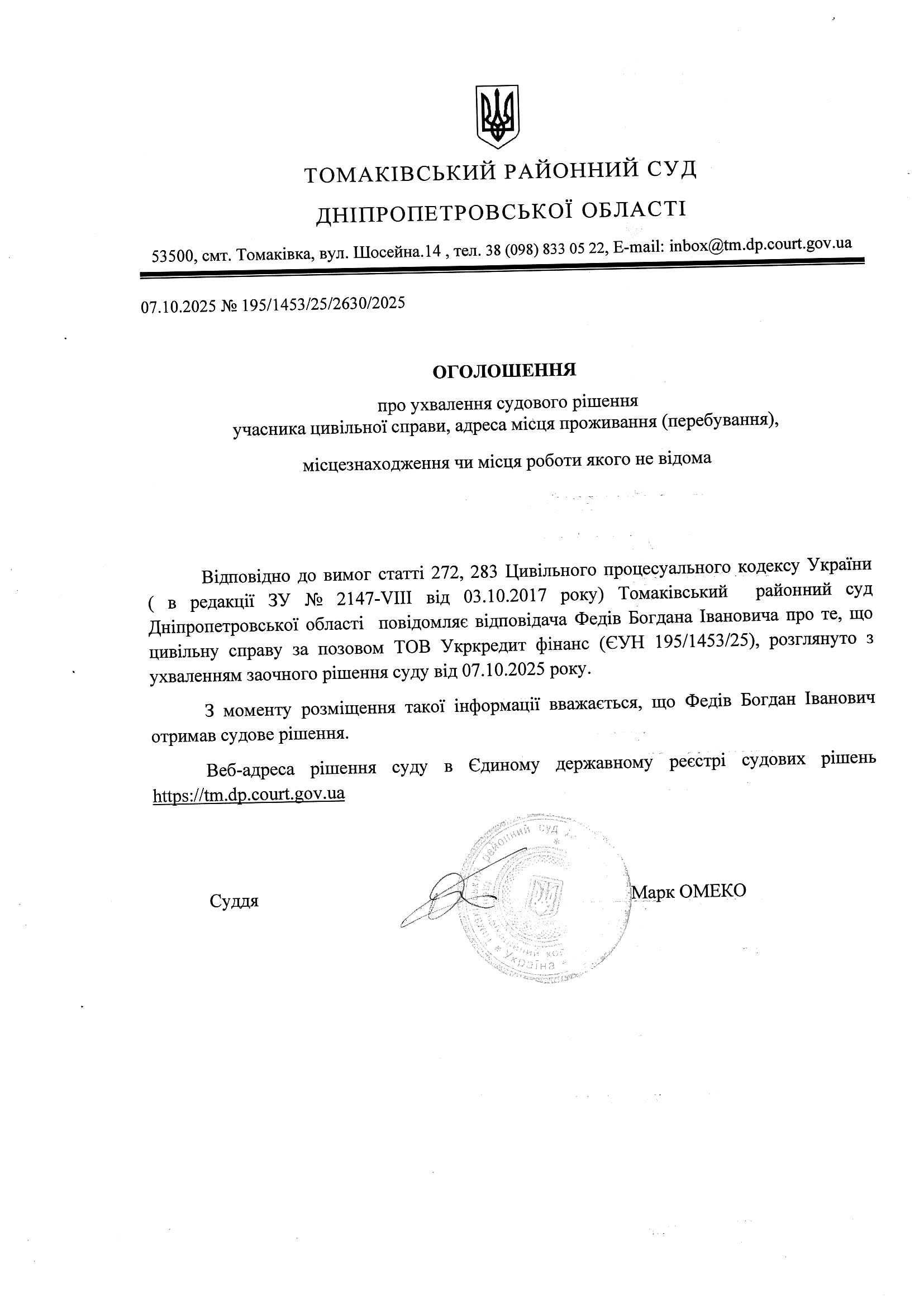 Оголошення про ухвалення рішення суду