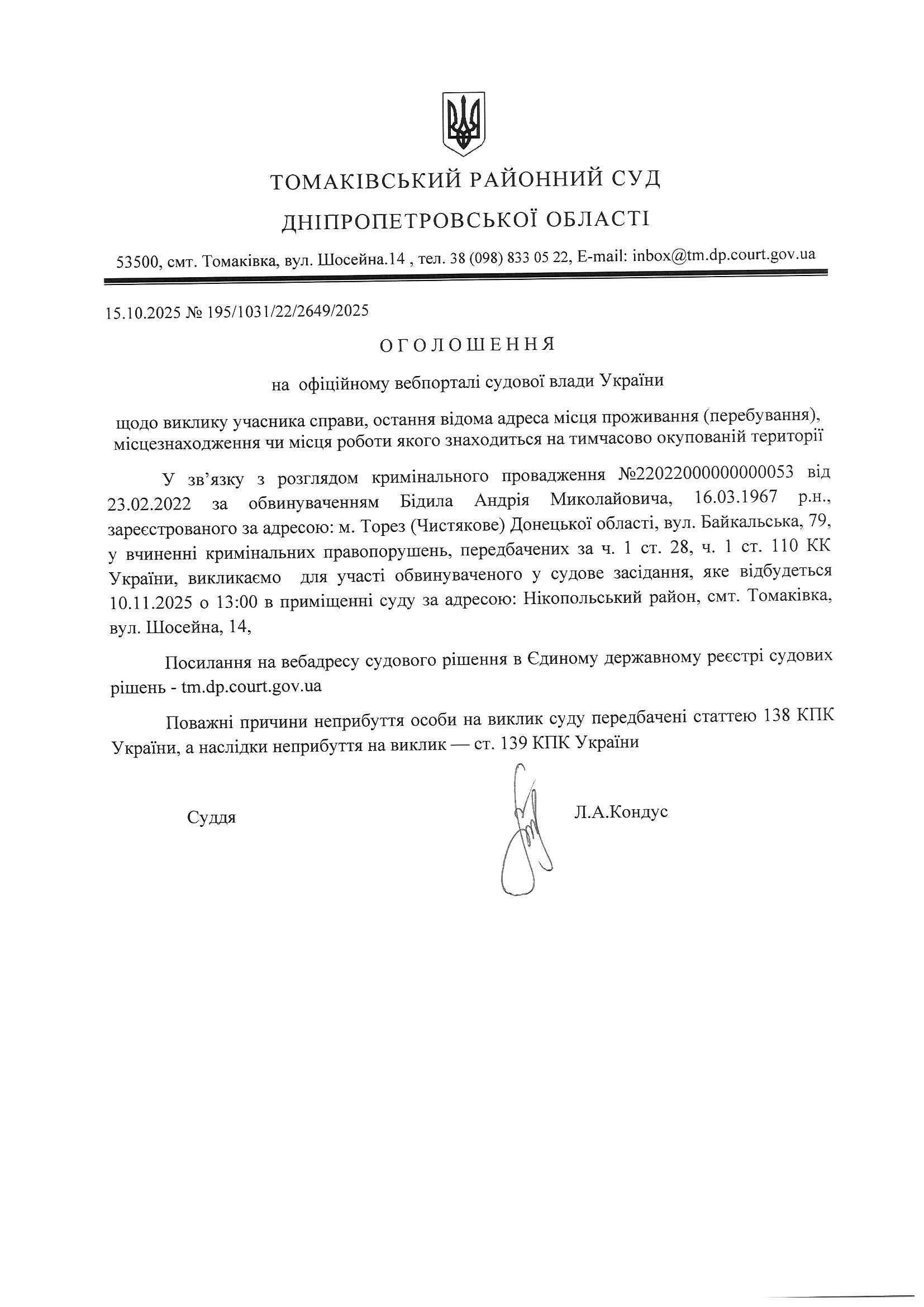 Оголошення про виклик до суду