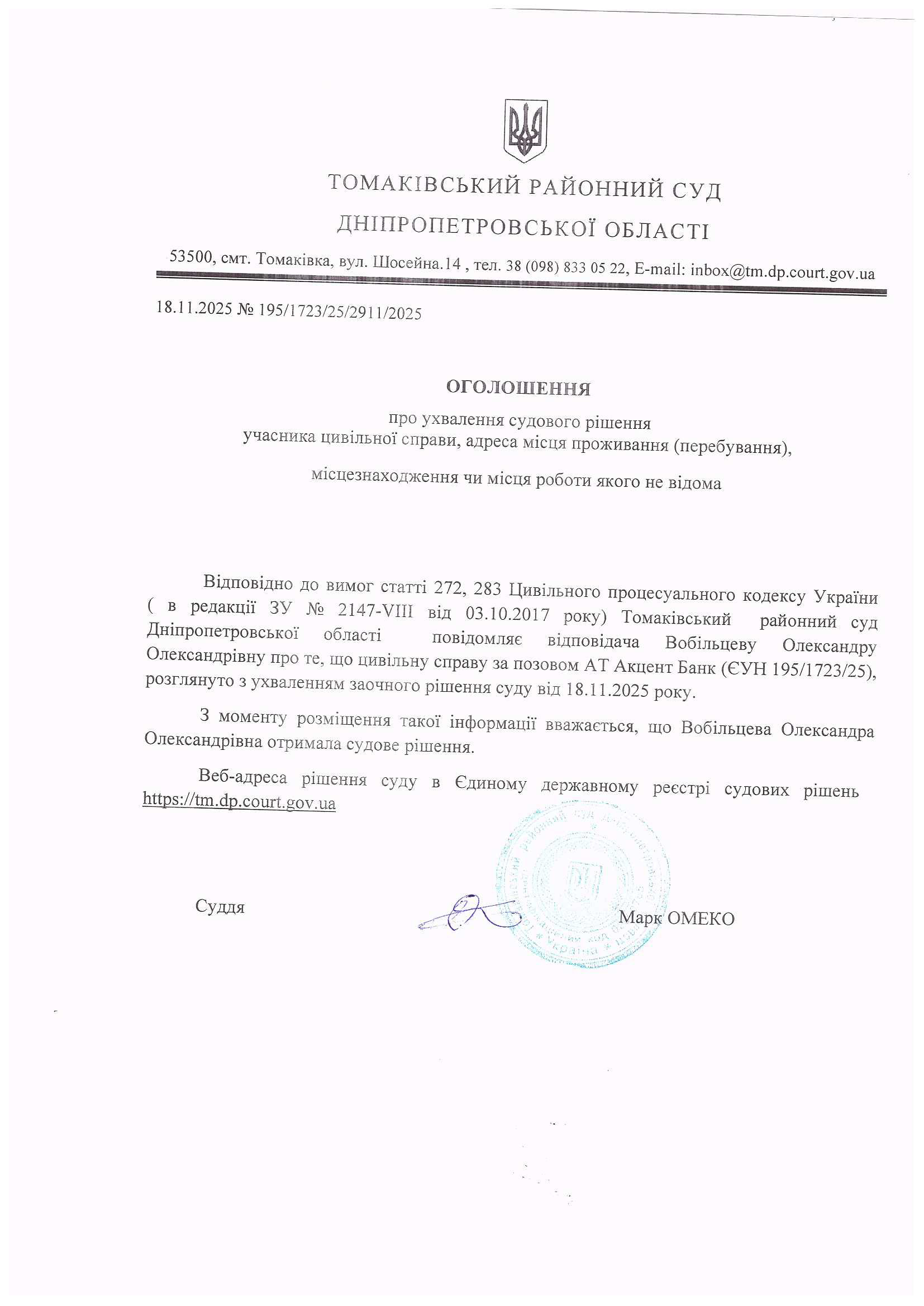 Томаківський районний суд Дніпропетровської області