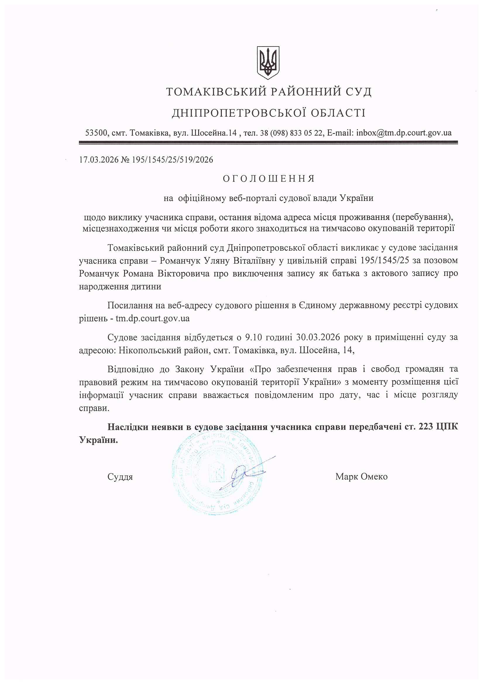 Оголошення щодо виклику учасника справи